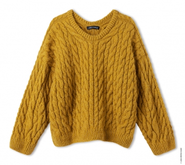 gemütlicher Zopfmusterpullover, der oversized getragen wird. Er wird