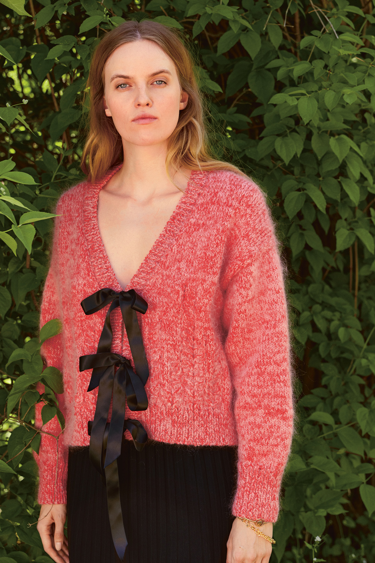 Die Jacke wird von oben nach unten mit 1 Faden jeder Qualität mit Double Sunday und Ballerina Chunky Mohair gestrickt.