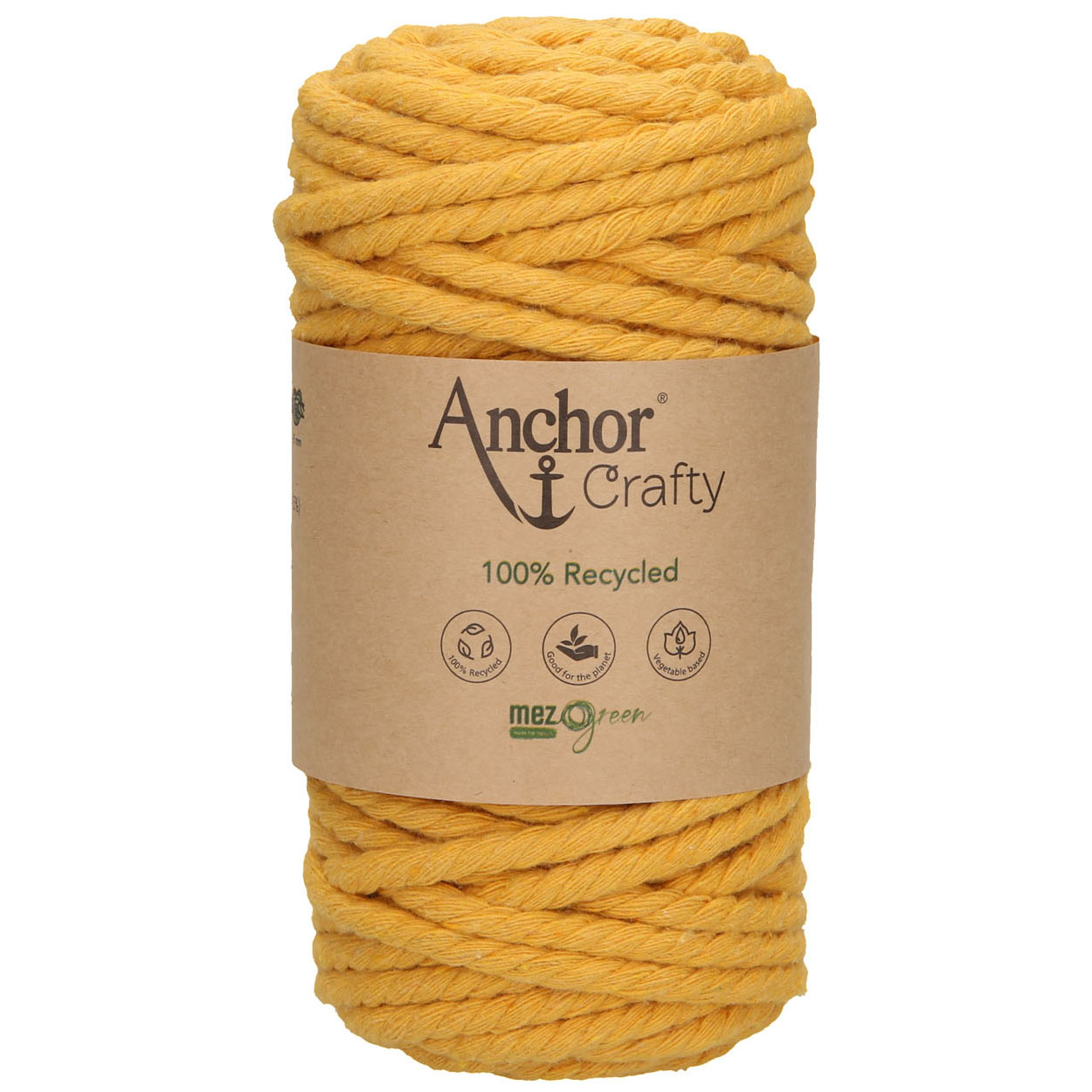 Das Kordelgarn ist ca. 5 mm dick und 3-fach gedreht. Es ist weich im Griff und angenehm zu verarbeiten, ideal für schnelle und einfache Projekte, darüber hinaus sehr gut für Anfänger geeignet. Aufgrund der Drehung kann Anchor Crafty auch leicht aufgedreht und gefranst werden, was speziell bei Macramee-Projekten einen attraktiven Federeffekt bewirkt.