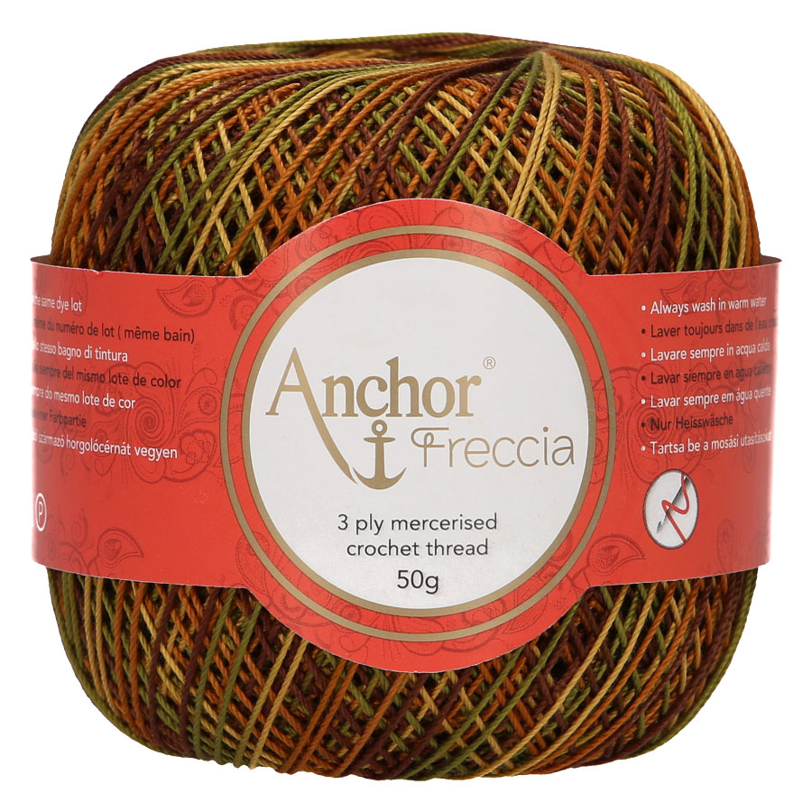 Anchor Freccia Häkelgarn aus ägyptischen Baumwolle ist das ideale Garn für Häkelpatchwork, aber auch für Filet- und Spitzenhäkelei. Es ist außerdem für andere Techniken wie Occhi und Klöppeln geeignet. Das 3fach gezwirnte, mercerisierte Baumwollgarn ist waschecht bei 40°C.