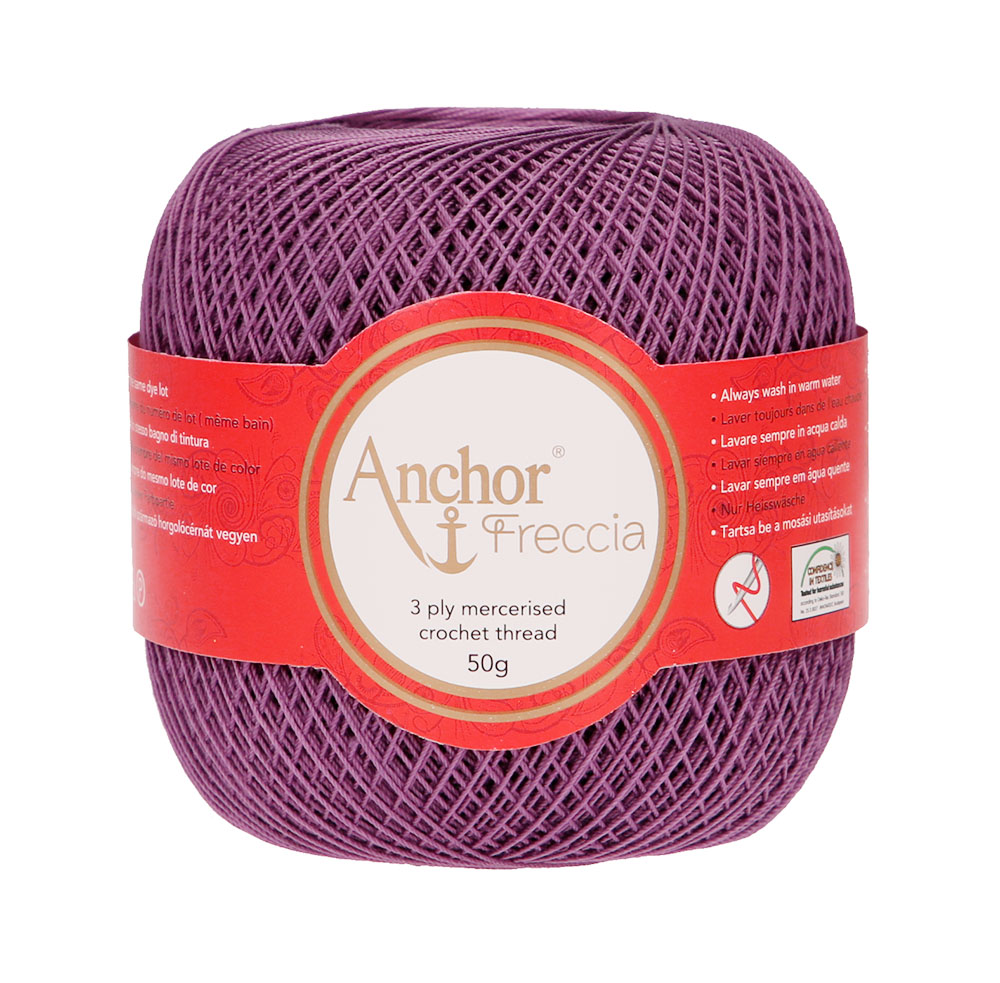 Anchor Freccia Häkelgarn aus ägyptischen Baumwolle ist das ideale Garn für Häkelpatchwork, aber auch für Filet- und Spitzenhäkelei. Es ist außerdem für andere Techniken wie Occhi und Klöppeln geeignet. Das 3fach gezwirnte, mercerisierte Baumwollgarn ist waschecht bei 60°C.