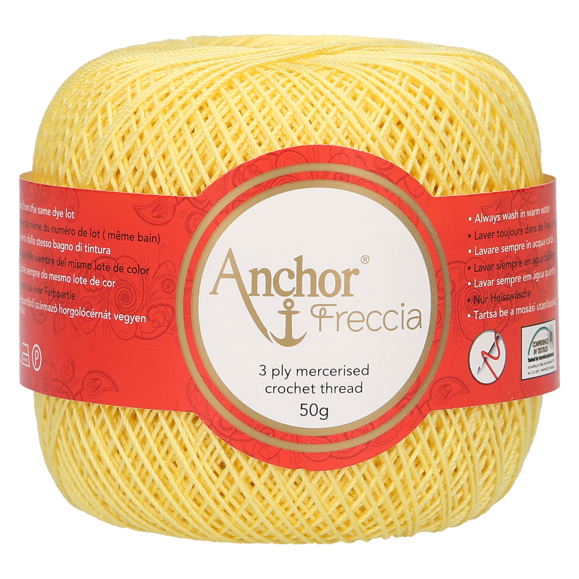 Anchor Freccia Häkelgarn aus ägyptischen Baumwolle ist das ideale Garn für Häkelpatchwork, aber auch für Filet- und Spitzenhäkelei. Es ist außerdem für andere Techniken wie Occhi und Klöppeln geeignet. Das 3fach gezwirnte, mercerisierte Baumwollgarn ist waschecht bei 60°C.