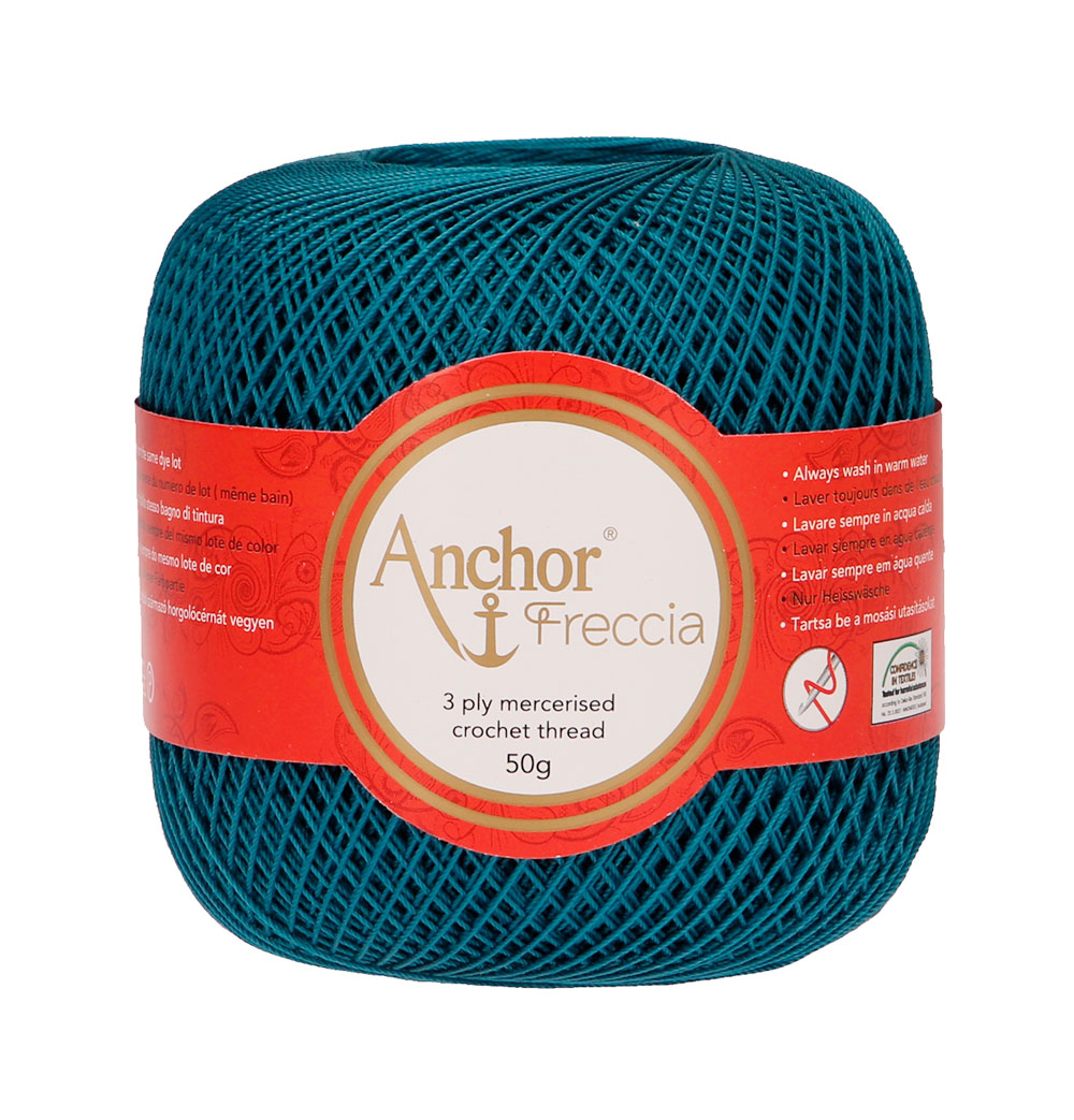 Anchor Freccia Häkelgarn aus ägyptischen Baumwolle ist das ideale Garn für Häkelpatchwork, aber auch für Filet- und Spitzenhäkelei. Es ist außerdem für andere Techniken wie Occhi und Klöppeln geeignet. Das 3fach gezwirnte, mercerisierte Baumwollgarn ist waschecht bei 60°C.
